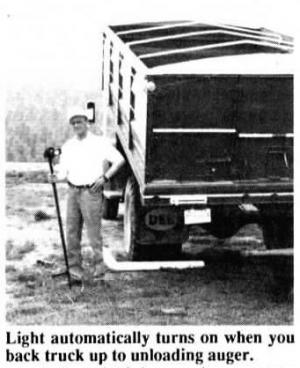 Another popular use of Guiding Light is to light up the grain handling area at night. When backing trucks or wagons up to the auger, the light can be set so it automatically turns on when the backing vehicle approaches the takaway unloading auger. The working area remains well-lighted until the truck leaves for another load. A "day delay" built into the sensor allows you to set it to respond only to movement during hours of darkness. Sensitivity of the motion detector can be adjusted so it won't respond to the movement of small animals or birds.