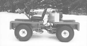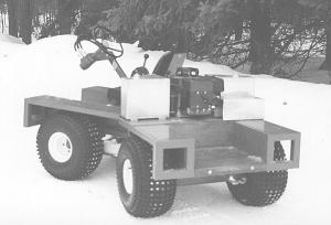 "It's designed to keep all four wheels on the ground at all times by means of an oscillating joint which allows the front and rear halves to twist independently of each other. Keeping all four wheels on the ground at all times gives it great climbing and pulling power. The hydrostatic drive provides a tremendous amount of torque at low speeds. I can edge the front wheels up against an 8-in. dia. log and climb right over the log with ease. Top speed is about 15 mph.