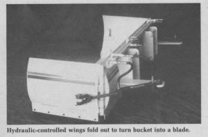 For moving silage, a pan attaches to the grader which transforms the unit into a 1 yd. capacity bucket. You can hook the pan up without getting off the tractor by driving up to the pan, then closing the wings.