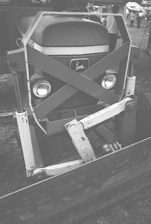 "It's a simple design that pushes from down low which eliminates the need for a 4-wheel drive tractor," says Kuriger. "Commercial front-mount blades push down from the front-end loader arm position which makes them difficult to control and steer. Our subframe keeps the weight on the front axle which results in good control and no loss of steering. The blade mounts close to the tractor's front wheels where it's easier to control, and the lateral and lift loads on the blade are taken near the front axle pivot point which is a strong part of the tractor.