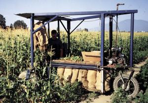 The 3-wheeled rig straddles two 40-in. rows and can hold up to 8 sacks of corn. The sacks sit on a steel tray that runs down the center of the machine. The driver fills the sacks as he goes along and lifts them onto the tray. Once the sacks are full he drives to the end of the row, releases nails that hold the sacks up, and removes the sacks.