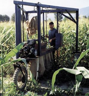 The rig is powered by an 8 hp gas engine and is driven by a single front wheel off an old motorcycle. The engine belt-drives a hydraulic pump that chain-drives the wheel. The rear wheels are off an old Deere grain drill. All controls are at the back where the picker can stand on the tray as he drives. A hand-operated winch with cable is used to steer the wheel. Separate control levers are used to adjust speed and to shift from forward to reverse. The machine's frame is made from 4-in. sq. steel tubing which also serves as a hydraulic reservoir for the pump. The 8-ft. high rig will clear 10-ft. high corn stalks with no problem.