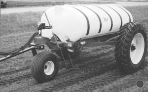 Also available are 300-gal. front mount tanks and new 3-wheel trailers equipped with 500, 1,000, or 1,600-gal. tanks. The tanks are oval-shaped for good visibility. The 1,600-gal. model has 18.4 by 38 tires with 10-bolt hubs and the 500 and 1,000-gal. models have 16.9 by 24 tires on rear. The trailers are de-signed to be pulled behind planters, cultivators, and 3-pt. sprayers.
