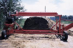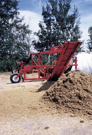 The unloader is powered by a 60 hp. air-cooled Wisconsin gas engine that drives a hydraulic pump. It powers the 16-ft. wide beater drum - which is fitted with square metal teeth arranged in a spiral pattern around the drum - and the rollers that roll up the plastic. The feed conveyor is also hydraulic-powered.