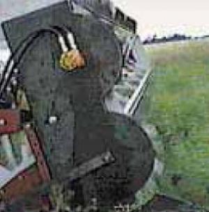 The patent-pending "Clean Cut" system consists of two 18-in. dia. rotary blades fitted with sickle sections. They mount in a housing that's positioned vertically on the side of the header. The blades mount one above the other and rotate 1/4 in. apart clock-wise, just the opposite of the reel. The lower blade, which rotates 1/3 faster than the top blade, lifts the lodged crop and the top one cuts it.