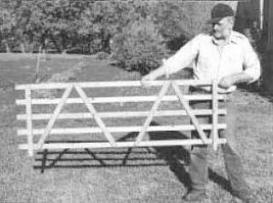 "Cows can get very protective," says Stan. "If you put the gate between yourself and the calf, you can move that calf anywhere you want and the cow won't attack you. We have never yet had a cow even threaten us when we had this between ourselves and the calf." The dimensions of the mini-fence are 6 ft. long by 22 in. high. The five dividing boards are 1 by 2 in. making the fence panel light and easy to hold. The fence has a crossbrace on each end with two "V's" to supply four more braces. The horizontal boards and V-shaped braces are bolted together.