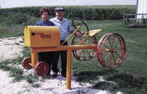 Our son-in-law built this steel-wheeled Minneapolis-Moline mailbox for my wife Betty and me. It's mounted on a big steel pipe and has turned quite a few heads in our area. I've farmed with Minneapolis-Molines and related tractors all my life, so I guess this mailbox was a natural for us. (Lloyd Monroe, RR 1, Castalia, Iowa 52133 ph 319 567-8344)