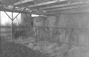 Dubois cuts the strings off the bales before placing them inside the shed. To feed the bales he moves the gate up against them. Then he just keeps moving the gate forward as needed.