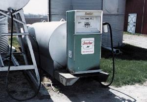 Roger Rosentreter, Carlinville, Ill., put together a mobile fuel service unit. A large storage tank and an old service station gas pump mount on a pair of large steel skids. It can be used on the farm for normal refueling or taken to the field. (C.F. Marley, Nokomis, Ill.)