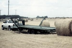 Developed by William Cheatham, the Hay Hawg will pick up and transport 10 big round bales behind a 3/4-ton pickup. Radio signals from the hand held remote, control every aspect of the machine.
