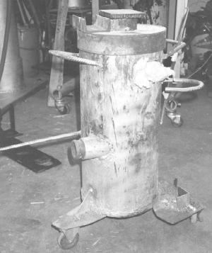Tangental Venturi Porpane Forge Used To Heat Treat Steel FARM SHOP Miscellaneous 25-1-28 Edward M. Storch, RR 4, Mannville, Alberta, Canada T0B 2W0 (ph 780 763-2214): "My hand-made knives are satin finished and are in use world wide. I custom make them using the same "forge welding" process that was used by old time blacksmiths. The idea behind forge welding is to heat the metal, put the flux on, and hammer-weld objects together. Using this process I can take a piece of steel cable or roller chain from a farm machine, heat it, flux it, and forge weld it into a bar which I later turn into a knife. The pattern of the different types of alloys in the steels shows up in the finished product. It looks quite artistic. I could use more common coal forges, but they're hard to get and are messy to use. Using my propane-powered forge welding equipment I can have the material hot enough to weld in only about 10 minutes.