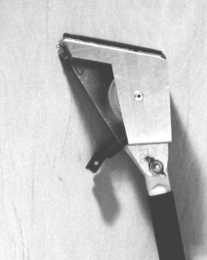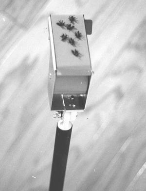 The head contains a 2-in. wide roll of high-adhesive tape. One section of the tape faces outward and is backed by a foam pad. You snatch the bugs simply by touching them with the tape. The bugs get absorbed into the foam-backed tape without being squashed. The bugs can simply be brushed off the head for disposal (a brush is stored inside the hollow wand, with an end portion of the wand forming the brush handle). The same section of tape can be reused many times, or it can be advanced and replaced by using a built-in cutter to cut off the used tape. By loosening a wing nut, the head can be opened up like a clam in order to replace the tape roll.