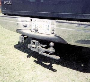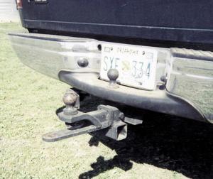 He mounted a tube crossways underneath the pickup's receiver hitch. When not in use, he uses it to carry a hitch assembly that consists of a ball hitch and straight drawbar. It's carried out of the way, underneath the back edge of the bumper. A smaller ball mounts on the bumper itself.