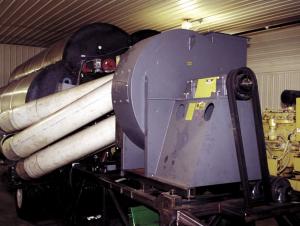 It requires a 200 hp. tractor to pull it and power the fan. A separate engine and hydraulic pump drive an array of hydraulic motors.
