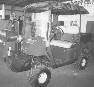 The kit converts the cart's non-driven front wheels to front wheel drive using a 3 1/2 hp DC motor to drive a hydraulic pump, which drives hydraulic motors in each front wheel. When 4-WD is needed, the driver uses his left foot to depress a pedal that engages the motor. His right foot is used in normal golf cart fashion to engage the rear wheels.