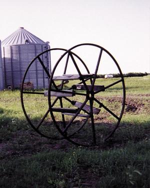 Here's a photo of a "safety wheel" that keeps us safe during the calving season. We got the 8-ft. dia., 3-ft. wide metal wheel for free from a local cable company, which used the wheel to install underground plastic pipes. The wheel has a series of wooden boards between the two outer rings. I use it whenever I have to go into a pen that has cows and calves in it. I roll the wheel up to the calf, keeping the wheel between me and the cow. Sometimes I carry a rope along so that I can catch the calf. If the cow comes at me I just duck behind the wheel. I have four of these wheels, one for each of our pens. (Maurice Van Walleghem, Box 177, St. Norbert, Manitoba, Canada R3V 1L6 ph 204 275-7195)