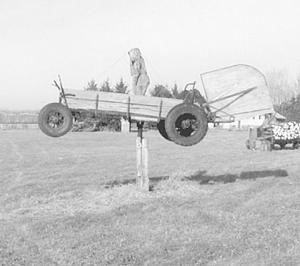 He attached a 4 by 6-ft. plywood blade to the back end of the 12-ft. long spreader and then mounted it on top of a post about 5 ft. off the ground. The spreader rotates on a cast iron spindle and axle, which is bolted vertically to a wooden post buried in the ground. The wooden figure of a person rises above the middle part of the wagon.