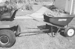 Hugh Morgan found a cheap way to make a dumping lawn cart by coming up with a way to hitch his wheelbarrow to a garden tractor. Now he can cover greater distances and dump loads quickly while still being able to use the wheelbarrow on its own.