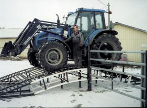 "Enns says that when building the ramp you want to make sure the two inside trusses are on the same spacings as your tractor wheels in order to provide adequate support. "On my ramp the two outside trusses are 2 ft. apart, with 6 ft. of space between the two sets. It's strong enough that I can drive my 12,000-lb. tractor loaded with a 1-ton round silage bale over it with no problem.