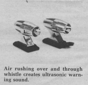 The Sav-A-Life, as it's called, is a 2-in. long bullet-shaped device that sticks to the car with an adhesive backing. At about 30 mph, air rushing over and through it creates an ultrasonic sound heard by some animals up to 1/4 miles away. At the high pitch of 16,000 to 20,000 Hertz, however, humans can't hear it and inside the car it can't be heard by either humans or animals.