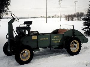 Stauch rebuilt the unit to look like a horse-drawn rig by fitting it with the front wheel assembly from a horse drawn spreader. Then he added a new two-cylinder, 18 hp engine, and a lawnmower hydrostatic transmission.