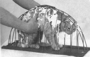 If you've ever tried to give a cat a bath, you know the cat will usually go crazy trying to get away. This new "Bathe N Carry" cage lets you reach in with your fingers yet keeps the cat from getting away. It can also be used as a carrier or a restraint when medicating.