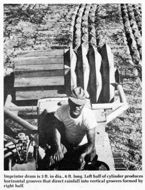 The imprinter drum is about 3 ft. in dia. and 6 ft. long. Half of the drum has a corrugated face that imprints grooves into the soil that; in turn, direct rainfall into grooves made by the other half of the imprinter. (See photo) Imprints can be made up into a number of shapes, all of which form a geometric pattern that has V-shaped bottoms to catch and retain the seed and soil moisture.