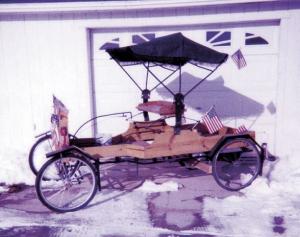 I made this replica of an antique 1901 Duryea car, which was manufactured from 1896 to 1903. I built my replica after seeing a photo of the car in a magazine. I started out by drawing a chalk pattern of the car on my shop floor. The car is powered by a 5 hp motor and has a 3-speed transmission. It has wagon-type brakes, a V-belt clutch, and 26-in. pneumatic wheels. I'm willing to build another Duryea car for anyone who's interested. (James C. Drullinger, 810 Adams Ave., Akron, Colo. 80720 ph 970 554-9090)
