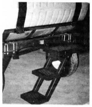 The top step of the 3-ft. long ladder is welded to the sprayer's rear frame. To fold the ladder, Scheel simply lifts the ladder for transport and a spring-loaded pin snaps into place. To lower the ladder, he pulls the pin out and the steps drop down automatically.