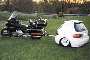 Trailer Made Out Of Two Wrecked Honda Cars WAGONS/TRAILERS Miscellaneous 29-5-42 This one-of-a-kind trailer was made out of two wrecked Honda Civic cars. I cut the cars in half, then turned one of them around and welded the two rear halves together to build a handy 5-ft. wide by 3-ft. long trailer. I pull it behind a 1993 Honda Goldwing motorcycle.