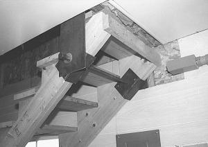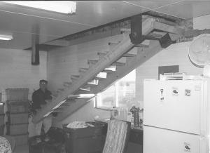 Rowden had Greg Kruger, a carpenter friend, build the staircase and a specially designed, heavy duty hinge to support its weight. The hinge consists of a pair of 8-in. wide steel plates. A salvaged truck axle serves as a spindle and runs through the plates and through a pair of U-shaped brackets that support the upper end of the staircase.