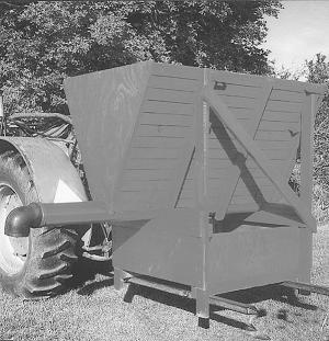 "The beauty of it is that I only had to buy some 2 by 4's and a little plywood for around the base to provide structural support," says Blaine Schumacher. "It holds 35 to 40 bushels of feed and rides on my rear-mounted bale forks. All I have to do is raise the bale forks to adjust to bunk height."
