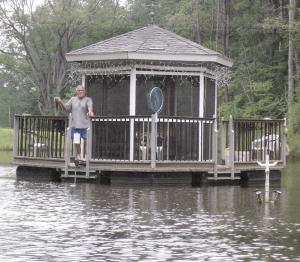 Mueller built the gazebo on skids prior to filling his pond for the first time. Using a backhoe, he dragged it into position, removed the skids and let the rising water set it afloat.
