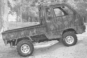 (Suzuki, Mitsubishi and Daihatsu models getting 40 mpg average. On-demand 4-WD, liquid-cooled engines, 4 and 5-speed transmissions. Can be camouflaged for hunting.)