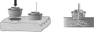 The serrated edge of the outer pot makes it easy to cut through plastic to set in a bag of soil or push into the ground. Once in place, the plant is set in the inner pot and topped off with soil creating a level higher than the surrounding soil. Fertilizer is applied to the inner pot while water is added between the walls of the inner and outer pots.