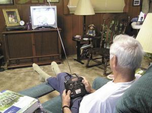 "I mow about three acres using this remote control system. It's become so useful that I also mow out in my pasture because I land my airplane there," he says. "I have ępicture in picture' television so I can actually watch TV while remotely mowing the lawn - I can be mowing on the little picture and watching the ball game on the big one."