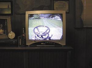 "I already had an old broken video camera that the recording feature didn't work on, so I mounted it on the lawn mower. This video is transmitted back to my television in the house with an off-the-shelf router device that's normally used for networking one computer with another. It cost about $150," Jones explains. "This is what allows me to watch the lawn mower on the television as it cuts grass."