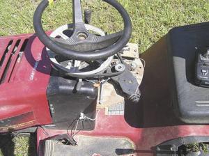 Jones installed a reversible 12-volt motor to run the steering wheel through a pulley and belt system. He used another 12-volt motor to control forward and reverse on the hydrostat transmission.