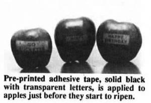 Bergman uses pre-printed adhesive tape which he buys in rolls of 500 for about $20. The tape is solid black with transparent letters. It must be applied to apples at the proper stage of growth, which is just before they start to ripen. In a normal year, tape is generally applied in August. As the fruit ripens, the letters change color but the covered background doesn't.
