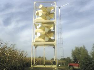 Fuller's patent-pending design stacks boxes of four structural steel wind scoops on top of each other. The pinwheel-like design has multiple points of impact for the wind to hit, so that any slight breeze turns the blades. His prototype is 12 ft. in diameter and three boxes tall, including a generator housing area at the bottom. He plans to stack nine 12-ft. dia. boxes over generators on 120-ft. towers.