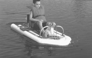 The paddleboat floats on 4-in. dia., schedule 20 pvc pipe and on a 2-ft. sq. piece of 1 1/2-in. high density styrofoam at the back. Its six direct-driven paddles are formed from 3-in. wide by 6-in. long flat plastic and are located in front, between the pedals. A metal frame made from 3/4-in. electric conduit supports the paddles. The frame is secured to the pipes with 3/8-in. thick, 24-in. long plastic zip ties.
