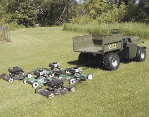 Each outside rear mower is connected to the gang by 2-in. wide steel straps. The straps form a V with their open ends bolted to the mowers and the point bolted to the end of a short length of 1-in. steel tube. The other end slides into the free ends of the 1 1/4-in. tubes. The combination of steel strap and a single bolt connecting them to the tubing allows them to flex individually. In order to back the gang mower up, Kuntz ran a third strap from the front bar to one side of the V straps on each of the mowers. This acts like a stabilizer, keeping it in line with the other mowers without affecting flexing action.