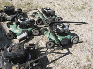 The gang of mowers consists of two mowers in the front row with a mower following on each side and in the center. The gang structure is designed so each mower is connected independently of the other mowers. The gang pushes the front two mowers while the rear mowers are towed.