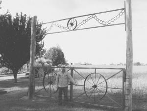 An 8-ft. wide double gate is part of an enclosure for his five horses. In the past, the enclosure was also used for some white deer that he was raising. The gate consists of two 4-ft. wide gates with a frame made from sq. tubing. The bottom half of the gate consists of expanded metal with a 4-ft. dia. cultivator wheel welded to it. The wheels are welded to the tubing. A series of metal bars extend vertically above the expanded metal.