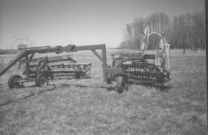 The simple hitch consists of a single wheel mounted on a dolly at one 4 by 4-in. leg of a 10-ft. long, 4 by 5-in. rectangular steel tube beam with a double wheel dolly at the other end. A rake is hooked to the bar at each dolly. In field mode, the beam runs perpendicular to the direction of travel, with the tow bar mounted mid way on the beam and locked in place. A tie rod connects the tow bar to the twin wheeled dolly, causing those wheels and the hitch to follow when the tractor changes direction.