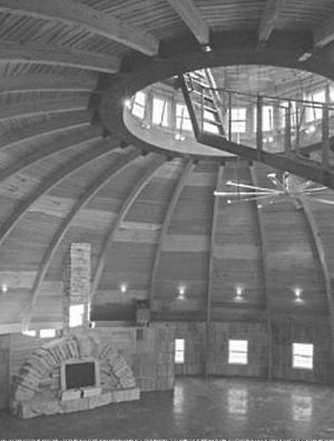 Round outside walls were laid stone. On the inside they were covered by 16, 11-ft. 4 1/2-in. high, flat sections. Exposed sections were composed of 24 by 24-in. panels, 6 wide and 5 tall, made from cherry, red oak, white oak, hickory and elm. The interior ceiling is covered with 12,000 sq. ft. of 3/4-in. thick, home sawn cherry with pieces of maple mixed in to create a spiral that carries the eye to the cupola. At one side is a massive 12-ft. tall, stone fireplace that rests on 9 tons of concrete. It has room behind it for restrooms with a banistered loft area above. On the other side of the barn are the kitchen and storerooms with a loft area above them as well. An aluminum staircase stretches in a 180? semicircle from the loft to the cupola, which has a railing for an observation area.