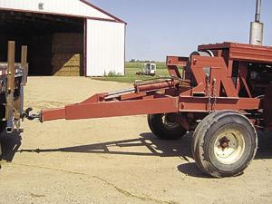 What's unique is the rig can quickly be set up to tow behind a pickup or semi trailer, allowing it to be hauled down the road at highway speeds. A hitch made from 8-in. channel iron bolts on back of the combine. The hitch is held in a vertical position until needed and then is extended by a hydraulic cylinder. Once the hitch is hooked up, the cylinder is extended further to lift the combine's rear axle off the ground.