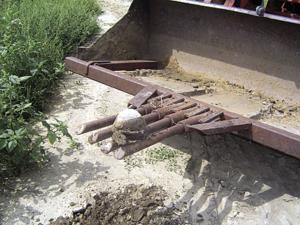 Rock picker: bolts on inside the loader bucket are equipped with four steel spears made from 1 3/4-in. dia. spring steel, which extend inside four larger pipes. A metal lip on front of the mounting frame serves as a "dam" to keep rocks from rolling back out of the bucket.