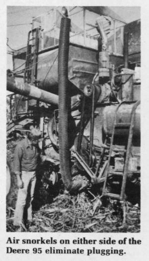 To get more air to the blower on his Deere 95, and eliminate the problem of husks plugging the screen, he installed two air intake "snorkels" ù one on each side of the combine (see photo).