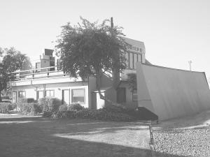 The second level æengine compartment' is a conference room with a large picture window that looks out to the main highway. Space beneath the operator's seat is a separate office. The exterior foot well is an open deck that continues across the back side of the second story, screened from the road.